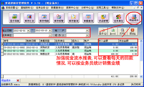 3.加強(qiáng)現(xiàn)金流水報(bào)表,可以查看每天的回款情況,可以按業(yè)務(wù)員統(tǒng)計(jì)銷售業(yè)績;