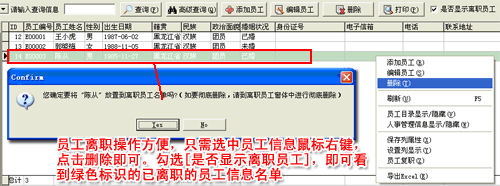員工離職操作方便,只需選中員工信息鼠標(biāo)右鍵,點(diǎn)擊刪除即可。勾選[是否顯示離職員工],即可看到綠色標(biāo)識(shí)的已離職的員工信息名單。