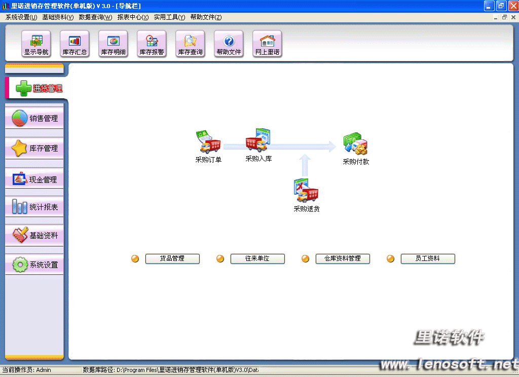 1> 下面我們以進貨管理為例,講述如何制做入庫單.點擊里諾進銷存導航界面上的【進貨管理】,再點擊【采購入庫】按鈕,如下圖所示: