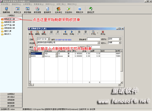 1.里諾倉庫管理軟件新增單據十分方便和快捷,點擊左側導航圖入庫登記面板里的"采購收貨入庫"(如下圖所示),在新增單據窗體里,點擊"新增"按鈕再依次錄好各個項目,錄好之后點擊"保存"按鈕即完成單據的新增.