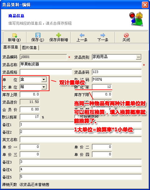 大單位:即同一物品有兩種計量單位,可相互換算。填入換算率即能換算。