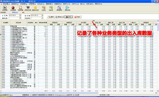 在庫存匯總表中記錄顯示各種業務類型的出、入庫數據。