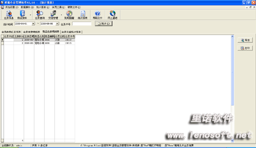 ●會員消費明細:在主界面上選擇“統計報表”,點擊“會員充值統計報”進入會員明細報表系統,選擇統計時間,點擊“統計“按鈕將所有消費信息顯示在數據表中。可以在“會員卡號”輸入會員卡號可以查詢到相應的會員消費 情況。點擊“導出”按鈕,文件將會以Excel格式導出。 點擊“打印”按鈕可以把數據表中的數據打印到已聯接好的打印機上。