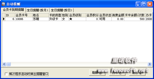 ●提醒查詢:在主界面上點擊“到期提醒”按鈕打開自動提醒窗口。在這里不能添加會員卡到期和生日提醒,會員卡到期提醒和生日提醒是在添加會員信息時系統自動添加 到到期提醒中。