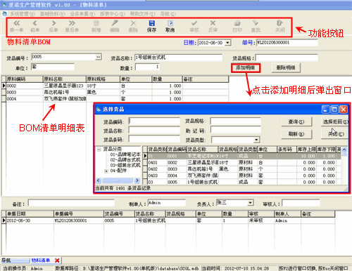 3、支持BOM物料清單,支持組裝計劃單和組裝貨品,對組裝貨品的原料進行當前庫存的查詢。