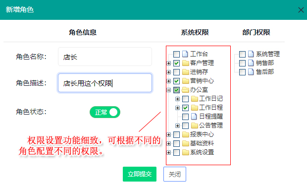 可以對角色信息進行編輯,并可對系統權限及倉庫權限進行調整。